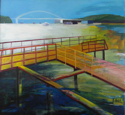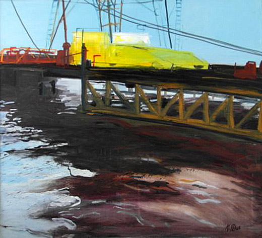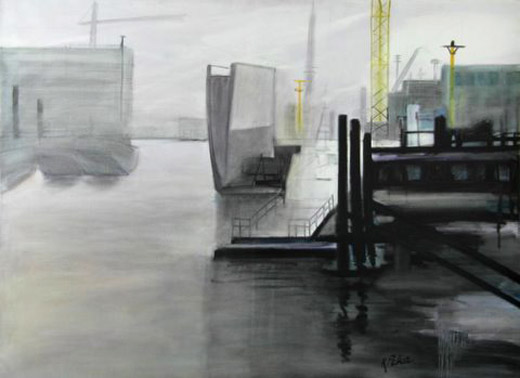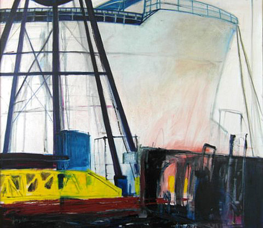 Grote zeeschepen in dok, kranen, zware metalen. Ik moest dit ook schilderen. Ik woon al zo lang in Rotterdam. En kijk, wat een prachtig landschap.
